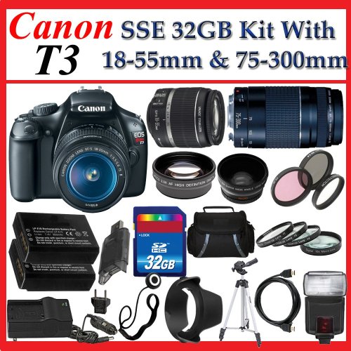 Buy Now : Canon EOS Rebel T3 (1100d) SLR Digital Camera w/ Canon EF-S 18-55mm f/3.5-5.6 IS II Autofocus Lens & Canon Zoom Telephoto EF 75-300mm f/4.0-5.6 III Autofocus Lens, 3 Extra Lens + Close Up Kit, 2 batteries and chargers 32gb Sdhc Memory Card, Soft Carrying Cases, Tripod & Much More !!